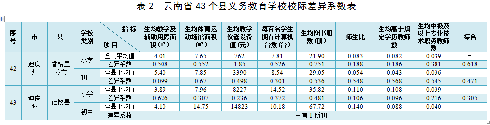 《办法》规定,对义务教育校际间均衡状况的评估,以生均教学及辅助用房面积、生均体育运动场馆面积、生均教学仪器设备值、每百名学生拥有计算机台数、生均图书册数、师生比、生均高于规定学历教师数、生均中级及以上专业技术职务教师数8项指标,分别计算小学、初中综合差异系数。评估标准为小学、初中综合差异系数分别小于或等于0.65、0.55。计算差异系数的8项指标数据来源于国家教育事业统计数据。差异系数是一组数据的标准差与其均值之比,是测算数据离散程度的相对指标。差异系数的值越小,说明县域内校际间的差异也越小,即学校间的均衡程度越高。核查结果是:云南省迪庆州香格里拉市、德钦县的小学、初中综合差异系数均达到了国家标准。其中小学综合差异系数在0.305-0.618之间;初中差异系数在0.160-0.536之间(详见表2)。