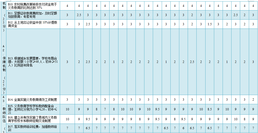 《办法》规定,义务教育发展基本均衡县的评估认定,应在其义务教育学校达到本省(区、市)办学基本标准后进行。各省(区、市)应根据相关的义务教育学校办学国家标准,制定既适应当地经济社会发展状况,又与国家标准基本相符的省级标准。云南省结合本省实际,就办学基本标准制定了4 个方面 23 项指标,包括生均占地面积、生均绿化面积、生均校舍建筑面积、生均体育场地面积、小学数学科学和初中理科教学仪器配备、音体美器材配备、百名学生计算机(台)、生均图书(册)、学生与教职工之比、高于规定学历的专任教师比例等10项核心指标。督导检查组对43个县的相关指标进行了核查。