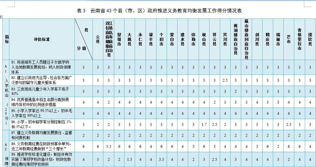 《办法》规定,对县级人民政府推进义务教育均衡发展工作的评估,主要从入学机会、保障机制、教师队伍、质量与管理四个方面17项指标进行,省级可适当增加指标,总分为100分,评估标准不低于85分。云南省根据实际,在实施办法中增加了6项指标,共23项指标,总分100分。核查结果:迪庆州香格里拉市、德钦县推进义务教育均衡发展工作均达到了国家规定要求,得分在88.5至97.0分之间(详见表3)。