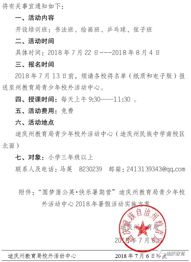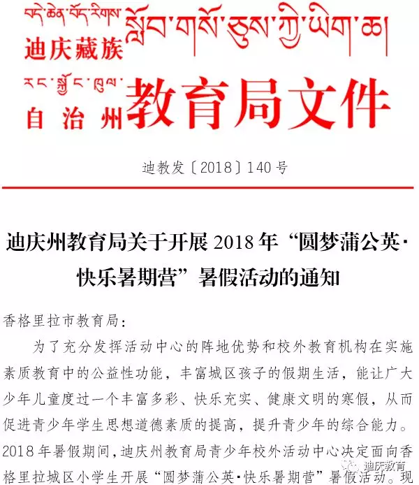 迪庆州教育局关于开展2018年“圆梦蒲公英·快乐暑期营”暑假活动的通知