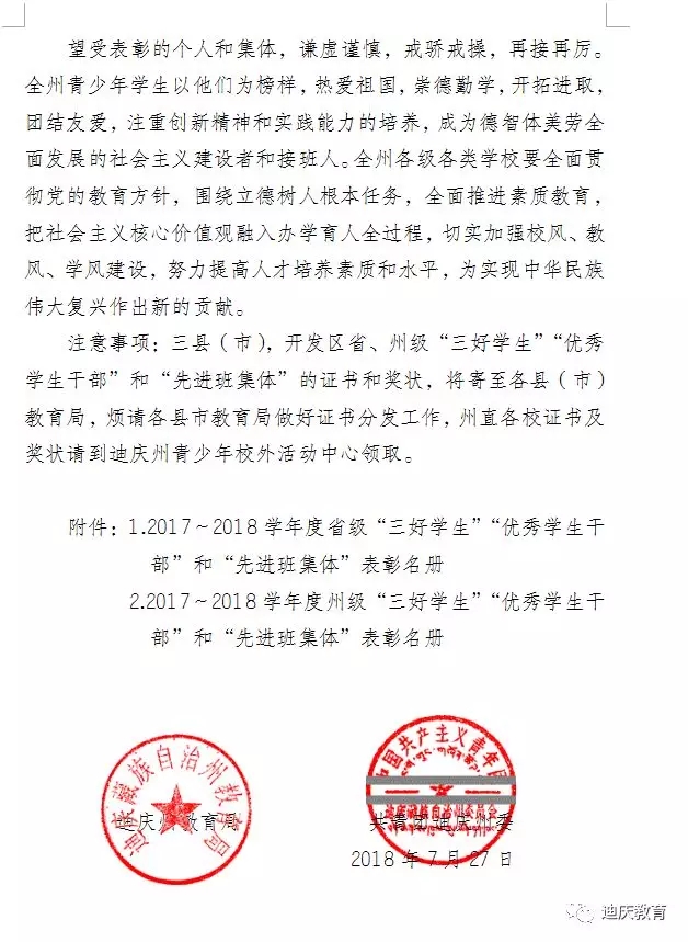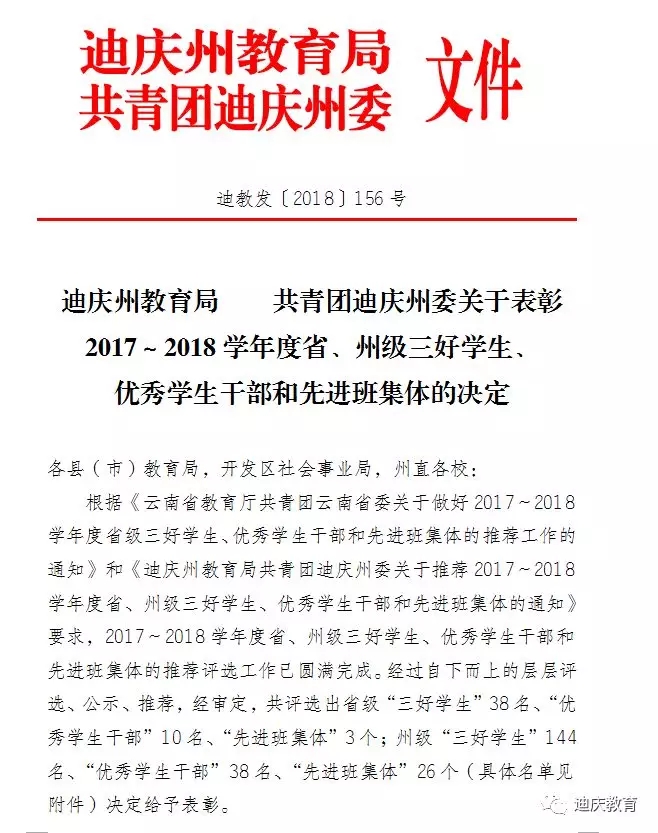 2017—2018学年度迪庆州级“三好学生”、“优秀学生干部”、“先进班集体”表彰名册