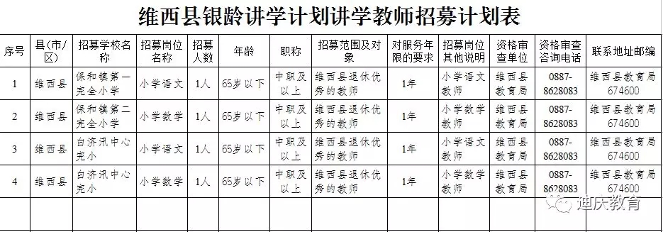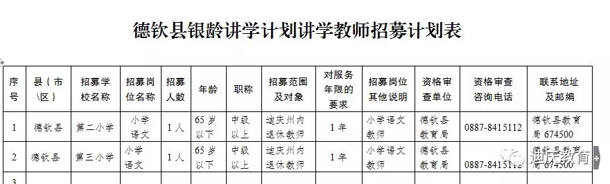 1.招募岗位(详见“附件1”《德钦县银龄讲学计划讲学教师招募计划表》)