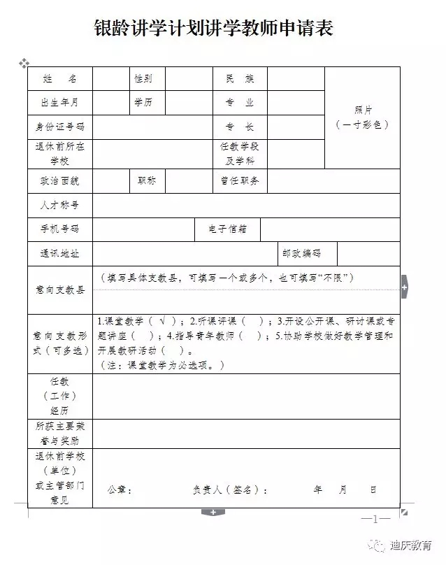 (2)网络报名:采取电子邮件投表方式进行报名,申请人认真填写《银龄讲学计划讲学教师申请表》,于2018年8月25日前传至德钦县教育局人事股邮箱870690244@qq.com