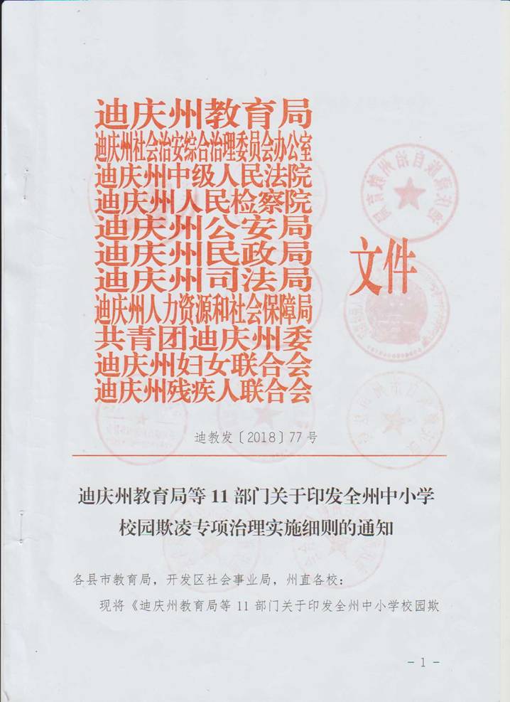 迪庆州教育局等11部门关于印发全州中小学校园欺凌专项治理实施细则的通知
