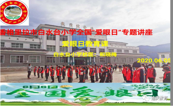 6月5日下午最后一节,大队委、二至六年级各中队的中队长、卫生委员在教学楼三楼会议室参加了由白水台小学校医和晓梅主讲的“爱眼日”教育课;和医生从爱眼日的诞生、掌握近视的发病原因、近视的危害和预防给同学们做了详细的讲解。要求学生能做到预防近视的“六不要”“四注意”以及“三个一”。