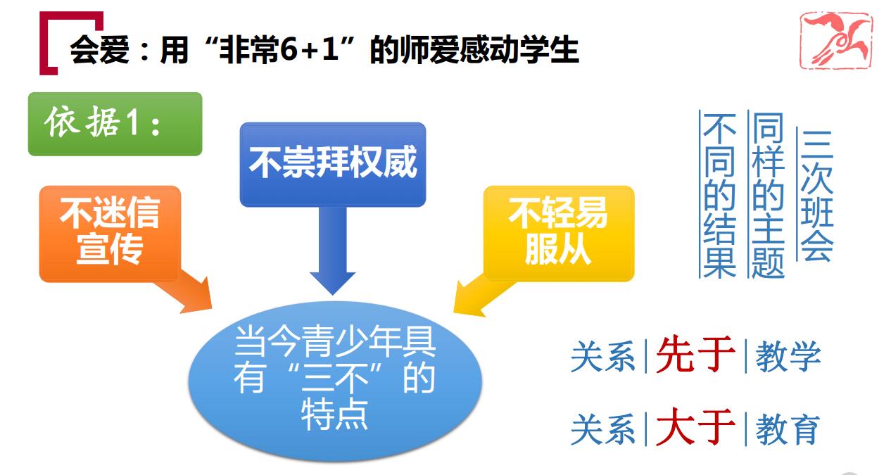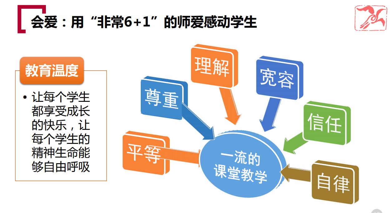 此外,李老师还提到用“非常6+1”的爱感动学生,即用平等、尊重、理解、宽容、信任、自律,打造一流的课堂教学。李老师表示,平等的爱是一种教育情怀,尊重的爱是一种教育力量,理解的爱是一种教育温暖,宽容的爱是一种教育魅力,信任的爱是一种教育激励,自律的爱是一种教育影响,一流的课堂是一种教育启迪。今天的老师,更应该用自己的人格魅力和学识魅力去感动学生,去影响学生,让学生感到被老师欣赏,被老师关爱,被老师尊重的温暖和幸福,让学生受到春风化雨、润物无声的感受和陶冶。