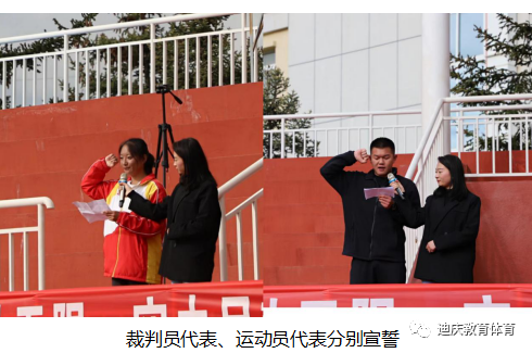 裁判员代表、运动员代表分别宣誓。全体裁判员、工作人员要本着“客观、公正”的态度,为比赛创造良好的环境。运动员们将发扬“友谊第一、比赛第二”的风格,要敢于拼搏,勇于进取,赛出风格,赛出水平,赛出成绩,为班级增光添彩。
