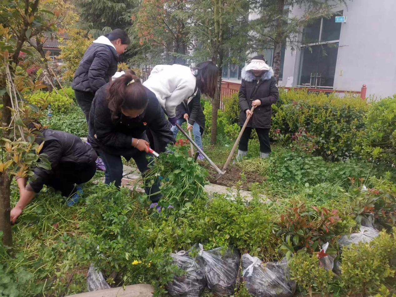 为提高绿化率,发动师生对校园内的草坪进行杂草清理,清除影响校园环境绿化的枯枝败叶。