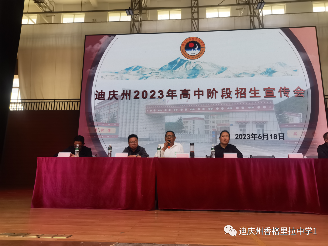 2023年6月18日14:30,迪庆州2023年高中阶段招生宣传会在迪庆州香格里拉中学体育馆举行。迪庆州教体局副局长肖丽琼、迪庆州香格里拉中学党委书记⻓张志云、迪庆州招生考试办公室负责人和延庆、迪庆州第一中学校长代兴宏、香格里拉职业学院招生处主任陈哲、迪庆州教体局人事科负责人吴晓斌、香格里拉市招办主任王江勇出席会议。香格里拉市初三毕业班师生及部分家长参加会议。会议内容主要是迪庆州教体局、迪庆州民族中等专业学校、香格里拉职业学院、迪庆州第一中学、迪庆州香格里拉中学的招生政策解读。