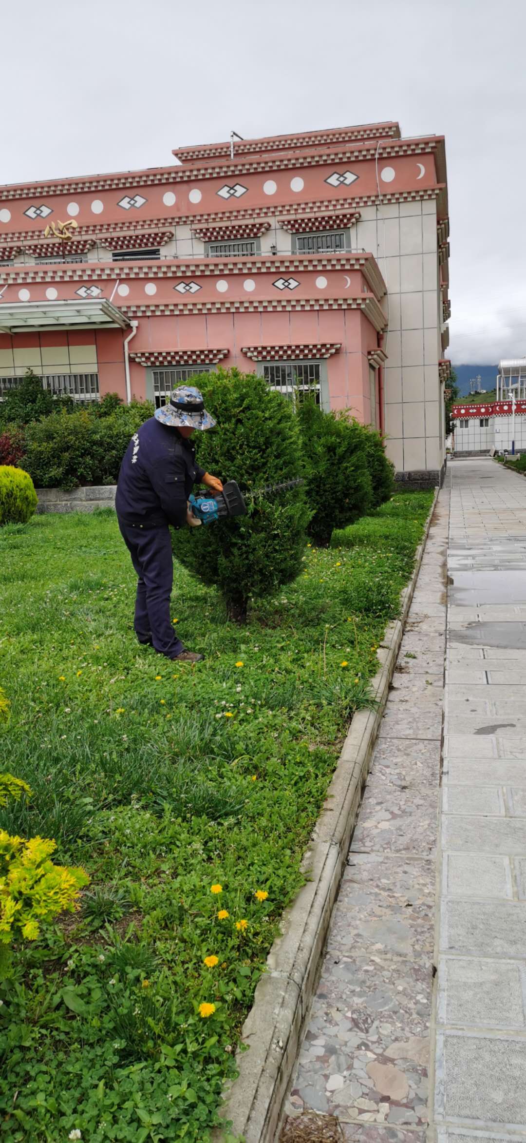 图为绿化工作人员修剪草坪