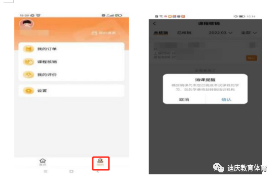 5.销课操作上完培训课程后,培训机构发起销课申请。若孩子正常上完了本节课,家长需在家长端APP“我的”页面,选择“课程核销”。家长确认销课后,本节课的费用将支付给机构,即完成了整个销课过程。