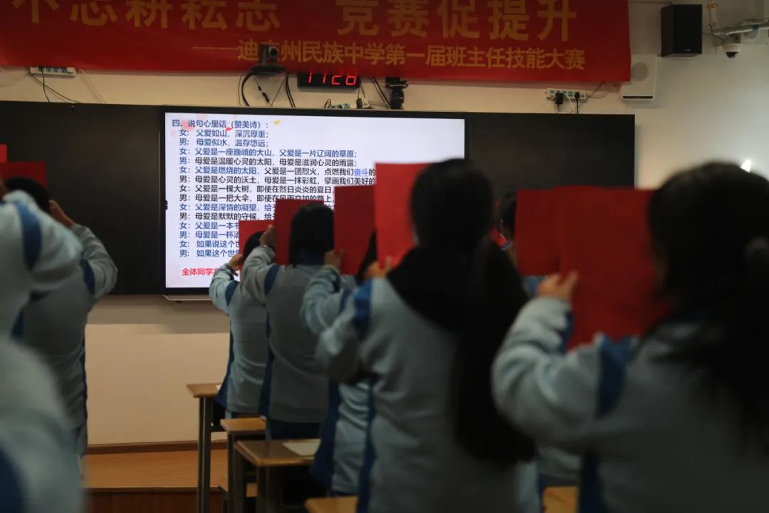 杨百合老师的班会以《知恩于心 感恩于行》为主题,结合本班同学的实际情况,教会同学们学会体谅父母,感恩父母。爱之深,责之切,父母对孩子的句句真挚的嘱咐打动着在场每一位同学的心,他们感恩父母,感恩老师,感恩学校,全体同学共同在课堂上许下奋斗的誓言。