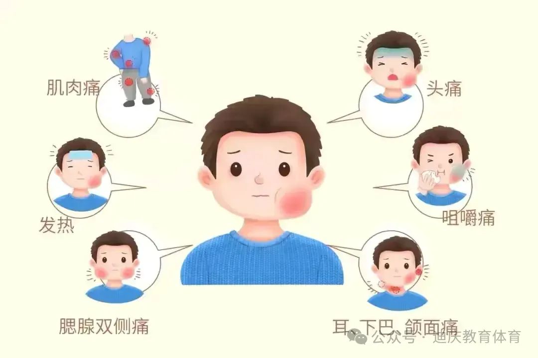 流行性腮腺炎是由腮腺炎病毒感染引起的传染性疾病,经呼吸道飞沫传播。主要症状是以耳垂为中心的耳垂下方肿大,常常一侧先肿大后另一侧也出现肿大,伴明显疼痛或压痛、张口困难、发烧等。