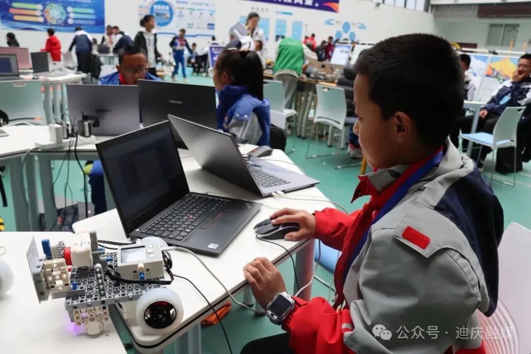 无人机竞赛环节竞争激烈,亮点频现。初中组个人飞行赛中,维西县第二中学彭双安、德钦中学次旺那吉、香格里拉市第一中学杨明星等选手展现出精准的操控能力;团队接力赛重点考验协同配合,维西县第三中学“扬子凡战队”、德钦中学“白玛顿珠战队”、香格里拉市第一中学“拉茸诺杰战队”等队伍在速度与默契上一较高下。小学组方面,白济汛中心完小段奕航、康普中心完小李浩楠、香格里拉市实验小学杨刘雪嫣等选手参与个人飞行赛角逐,团队接力赛与编程挑战赛也同步举行,为小学生搭建了科技实践的平台。