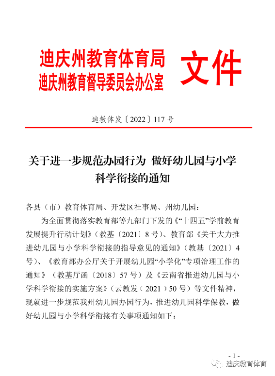 迪庆州关于进一步规范办园行为做好幼儿园与小学科学衔接的通知